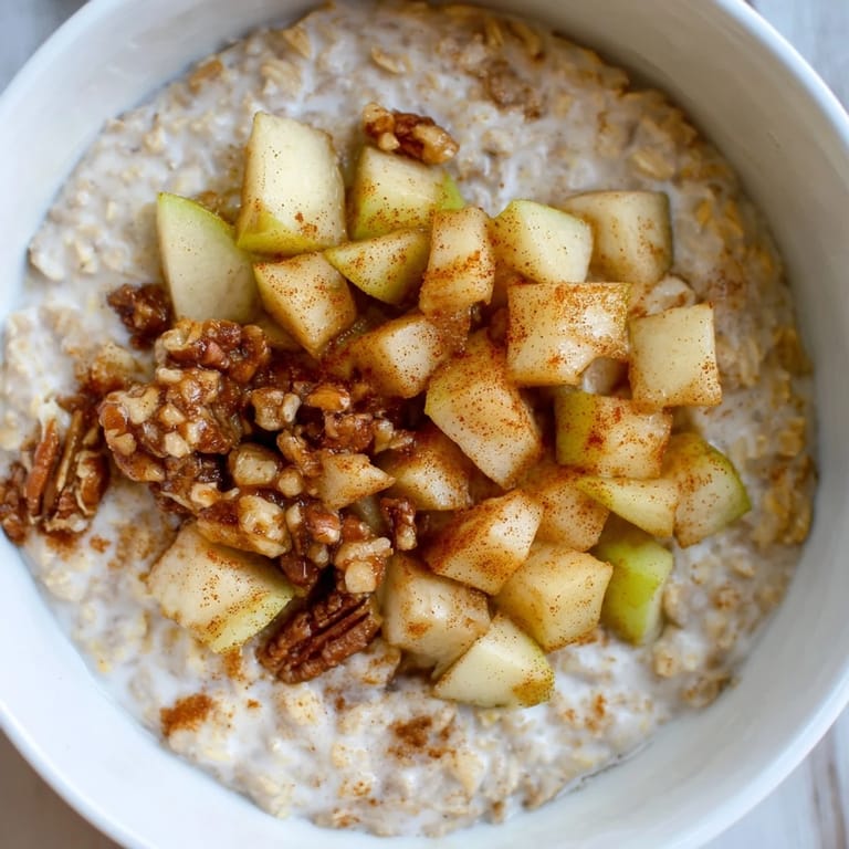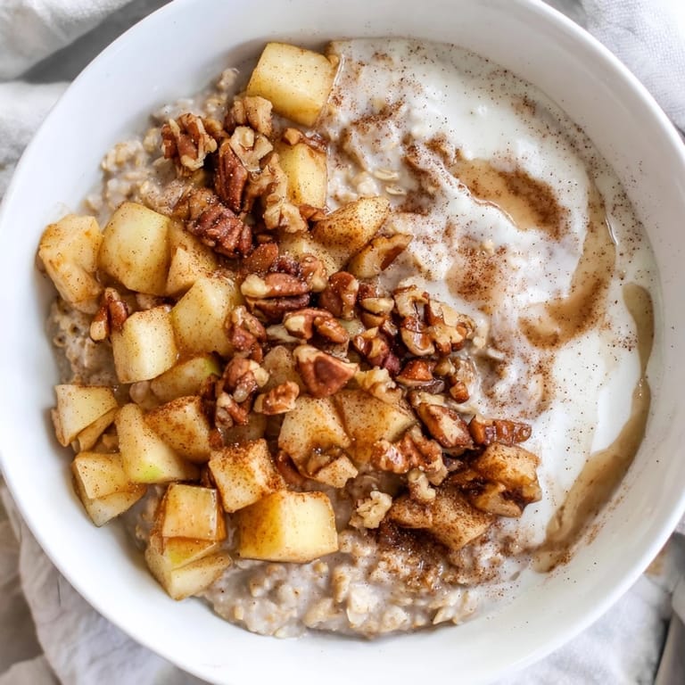 Save to Pinterest There's something about the smell of cinnamon hitting a warm kitchen on a quiet morning that makes everything feel possible. I stumbled onto this apple pie oatmeal bowl on a Saturday when I was tired of the same cereal routine and had a couple of apples sitting on the counter getting soft. Twenty minutes later, I had a steaming bowl that tasted like dessert but actually filled me up for hours. It became my go-to when I needed comfort in a bowl without the guilt.