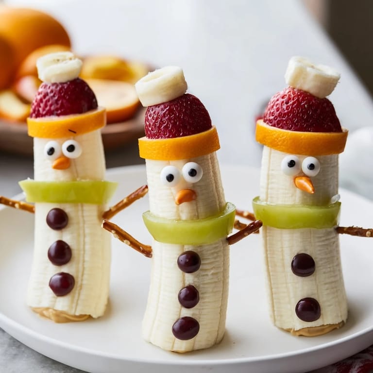 - Decorations: 16 mini chocolate chips (for eyes), 24 mini orange candy-coated chocolates or orange sprinkles (for noses), 32 mini pretzel sticks (for arms), 8 red grapes or strawberries, sliced (for hats), 8 thin apple slices or green grapes, halved (for scarves), 16 raisins or currants (for buttons)