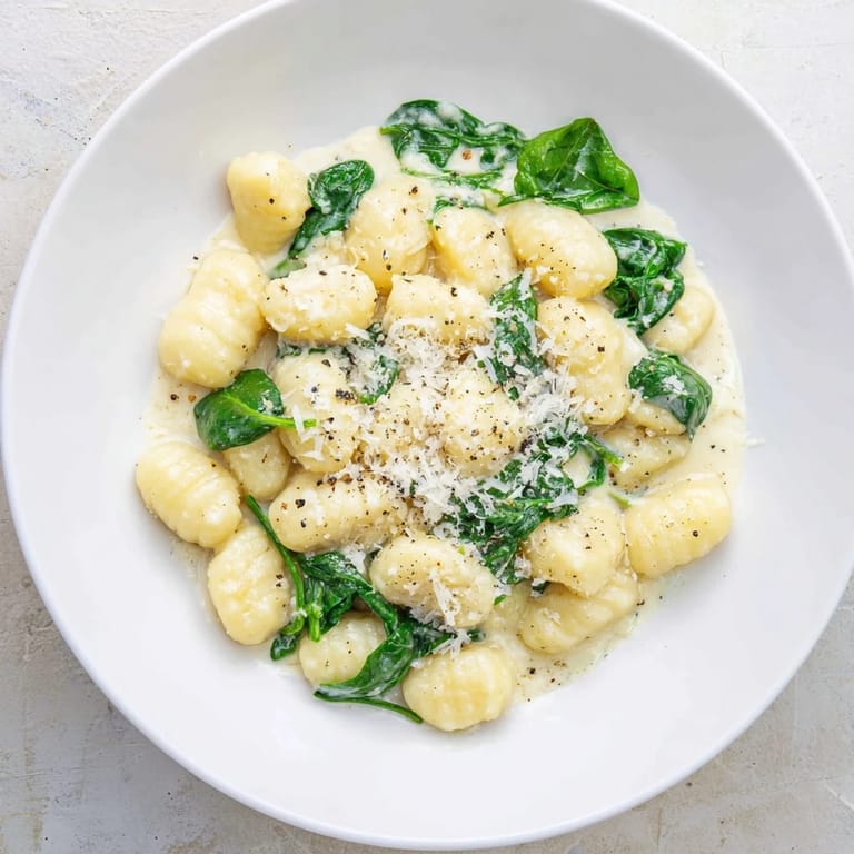 I made this for a friend who'd just moved into her first apartment with nothing but a hot plate and two pans. We stood in her tiny kitchen, the windows fogged from steam, and she kept saying she didn't know cooking could feel this easy. The spinach wilted into the cream, turning everything a soft ivory-green, and we ate straight from the skillet because she hadn't unpacked her bowls yet. That night, with mismatched forks and too much Parmesan, the dish became her first real meal in a place that finally felt like home.