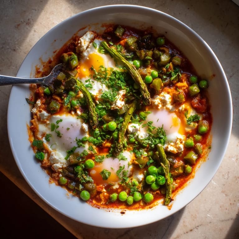 Save to Pinterest This recipe has become my go to for those moments when I want something comforting but still fresh, when the weather cannot decide if it is winter or spring. There is something incredibly satisfying about sliding a piece of bread through that sauce and catching an egg yolk, a sweet pea, and a salty crumble of feta all in one bite.