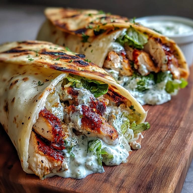 Save to Pinterest My friend texted me one afternoon asking what was for dinner, and I realized I had grilled chicken, some naan in the freezer, and a half-used bottle of Caesar dressing staring at me from the fridge. Instead of making the same salad I'd made a hundred times, I decided to wrap everything in warm, garlicky naan—and honestly, that happy accident has become one of my go-to meals whenever I need something that feels both fancy and effortless. The combination of crispy romaine, smoky chicken, and buttery naan hit differently than I expected, and now my kitchen smells like garlic and char every time I make these wraps.