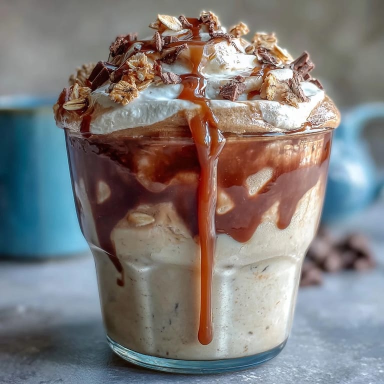 These overnight oats dessert jars shine brightest when served chilled, straight from the refrigerator. For an elevated presentation, layer the oat mixture with extra yogurt or chocolate sauce in clear glass jars to create visible stripes. Pair your jar with a shot of espresso or a glass of cold brew coffee for the ultimate coffee lover's breakfast experience. If serving at a brunch gathering, set up a toppings bar with whipped cream, various chocolate shavings, caramel sauce, crushed nuts, and fresh berries so guests can customize their jars. For a lighter option, enjoy the oats without the whipped cream topping and add fresh fruit instead. These jars are best consumed within two days of preparation for optimal freshness and texture.